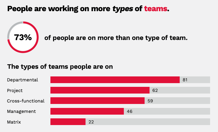 Our research shows that today’s teams are more complex: Employees work on more teams and with more people on a daily basis compared to just five years ago. 76% of employees are part of at least two teams within their organization, most often working on two to three teams.