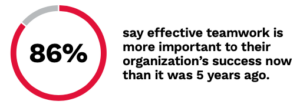 Developing those teamwork skills is also critical to the organization’s success. 86% of respondents stated that effective teamwork—specifically, the ability to work with others to achieve results—is more important to their collective success now than it was just five years ago!