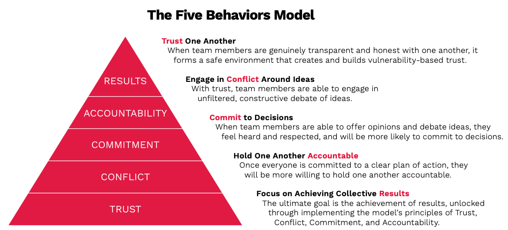 In his best-selling book, The Five Dysfunctions of a Team, Patrick Lencioni, introduces a powerful and approachable model for effective teamwork and collaboration. According to Lencioni, there are five key behaviors that a team must practice to work effectively with one another: Trust, Conflict, Commitment, Accountability, and a focus on Results. Each behavior is important independently, but also in laying the foundation upon which the next behavior is built. Conversely, the absence of any of these five critical behaviors can cripple teams and organizations. Thankfully, with persistence and hard work, people have been using Lencioni’s model to improve their teams for nearly two decades.
